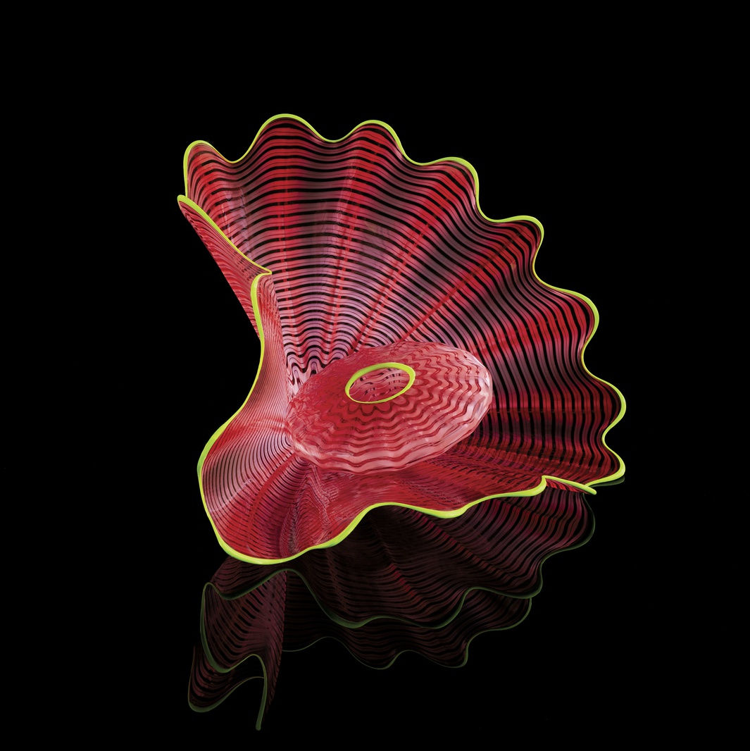 The first Seaform Studio Edition composed of three individual elements, Chihuly Workshop's 2021 Seagrass Seaform is a remarkable representation of Chihuly's penchant for assembling distinct forms into one unified vision. The largest element presents a transparent center that directs attention to the brilliant blue "ribs" and kelp green edges, while a smaller form in opaque chartreuse rests within. Echoing the palette of blue and green, a curlicued element winds its way from within the composition to bring balance to the juxtaposed qualities of transparency and opacity. A dramatic red lip wrap on all three elements contributes a vibrant contrast.