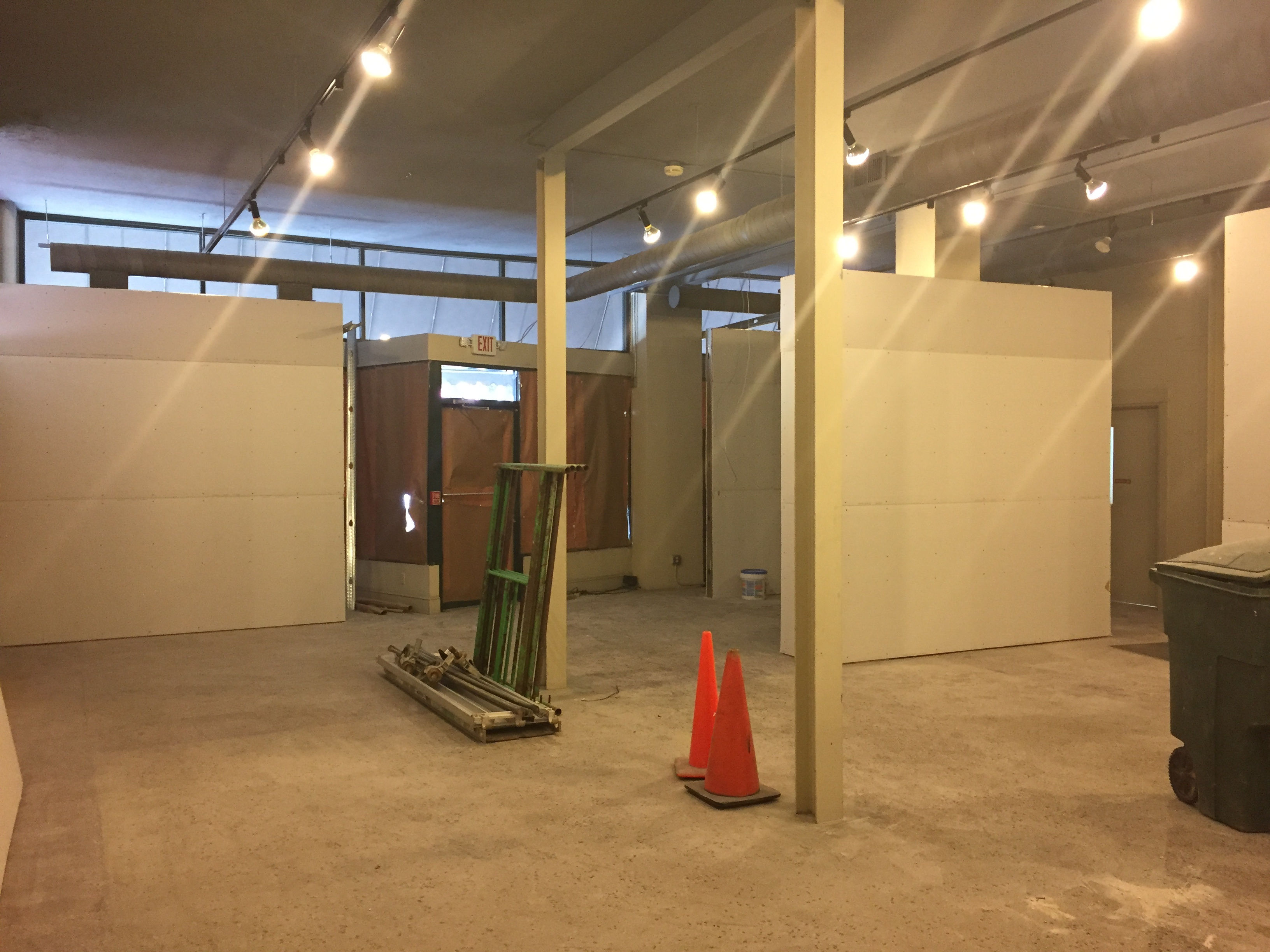 As many of you have heard, our new gallery space will unfold in several phases over the coming months. The current timeline includes an intial relocation this fall, to begin establishing Momentum Gallery's new and permanent home at 52 Broadway Street, next to Mellow Mushrooom. Contractors are working diligently to get us into the space as soon as possible. Partitions are up, and the space for Phase 1 has begun to take shape in the section of the historic building that previously housed Stuf Antiques. Clean lines define dramatic open areas as well as intimate spaces with work stations that are at once accessible and set back. Sheetrock is nearing completion and the space will be painted next week. The flooring and some other minor cosmetic work still need to be addressed, though we anticipate these items progressing quickly.