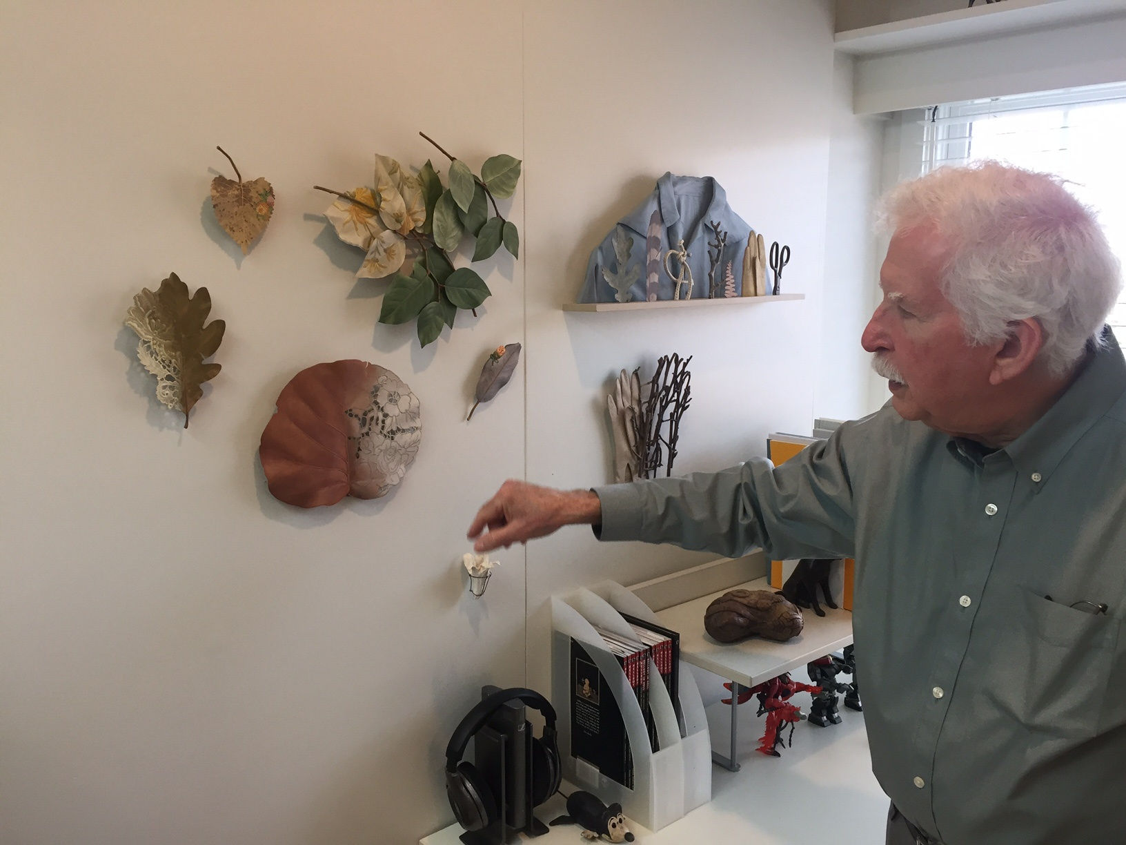 I very much enjoy the fusion and confusion of real and illusory form. So part of it is actual form, which is where I have a leg up on the old trompe l’oeil painters, and the illusion of form I get from color and value changes and details that are painted on that. I use acrylic paints, I couldn’t possibly deal with the drying time of oil. This means I’ve had to develop some drybrush techniques and other techniques to be able to blend smoothly because you can only do so much wet into wet. Actually I do very little wet into wet. This is not the way I was trained to paint, I was actually a fairly painterly painter using oils until 1967. I’m still painterly because I see painterly. You can’t see a lot of brushwork in my pieces, but I’m not afraid for you to catch me painting. I’m not trying to completely hide the presence of a painter.