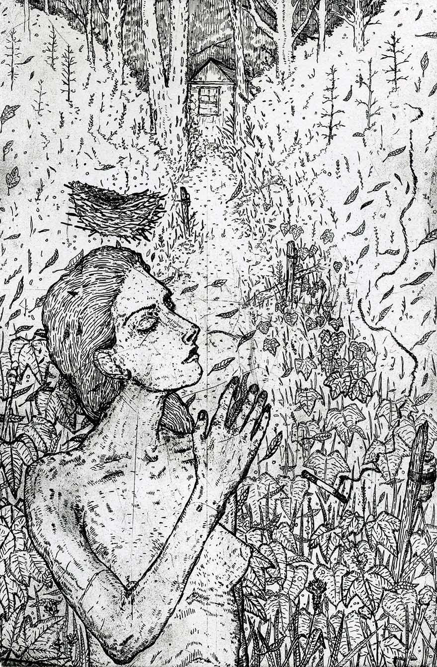 Sasha Schilbrack-Cole, Comforted, but not for long, etching, 8 x 6 inches
