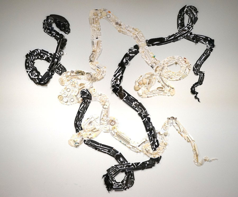In keeping with the movement of drift of these material artifacts, I prefer using them in a transitive form as installation. All of the work can be dismantled, reconfigured but nearly impossibly recycled. The objects are presented as specimens on steel pins or wired together to form larger structures. I am a conceptual artist with a strong affinity to materials and process. I was trained as a painter and printmaker, and continue this in my studio practice, but have always worked in varying mediums from photography to painting and collage to installation, allowing the ideas to dictate the materials I work with. I am interested in the collision between nature and global consumer culture. Ocean plastic is a material that can unleash unpredictable dynamics. I am interested in it in particular, as opposed to all garbage in general, because of what it reveals about us as a global culture and what it reveals about the ocean as a type of cultural space, as well as a giant dynamic engine of life and change. As a product of culture that exhibits visibly the attempts of nature to reabsorb and regurgitate this invader, ocean plastic has profound stories to tell.”